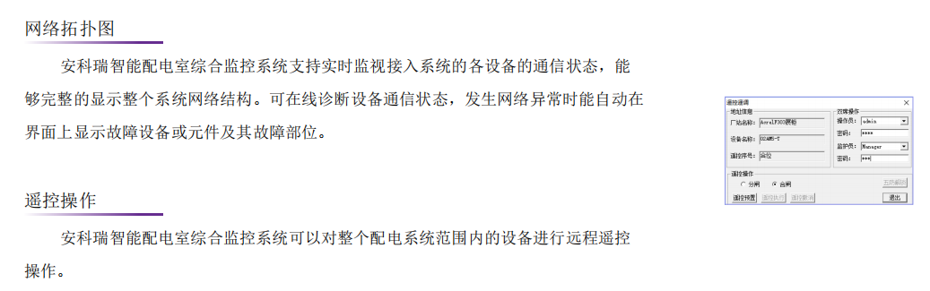 Acrel-2000E配電室綜合監(jiān)控系統(tǒng),可實現開關柜運行監(jiān)控、高壓開關柜帶電顯示、電流電壓等負載運行監(jiān)測、母線及電纜測溫監(jiān)測、環(huán)境溫濕度監(jiān)測、有害氣體監(jiān)測、安防監(jiān)控,可對燈光、風機、除濕機、空調控制等設備進行聯動控制。實現動力環(huán)境各數據的檢測與設備控制,優(yōu)化動力環(huán)境,避免運行環(huán)境的失控導致配電設備運行故障,保證維護人員安全,延長設備使用壽命,實現配電動力環(huán)境的分布式遠程管理。