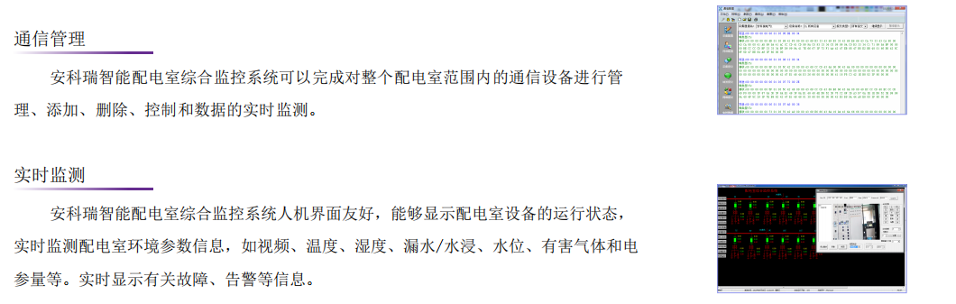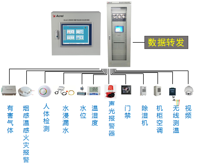 安科瑞電氣股份有限公司根據配電室實際情況,結合多年的變電站和配電室的運行管理經驗,自主研發(fā)了Acrel-2000E配電室綜合監(jiān)控系統(tǒng)系列化產品,通過采集配電室的溫濕度、水浸、煙感、門禁、氣體和視頻等相關數據,及時掌握配電室現場情況,通過可靠的聯動策略實現系統(tǒng)的有機集成,有效解決了視頻監(jiān)測、環(huán)境監(jiān)測、安全警衛(wèi)、門禁、消防和智能控制之間的互聯互通,降低了系統(tǒng)的建設成本。