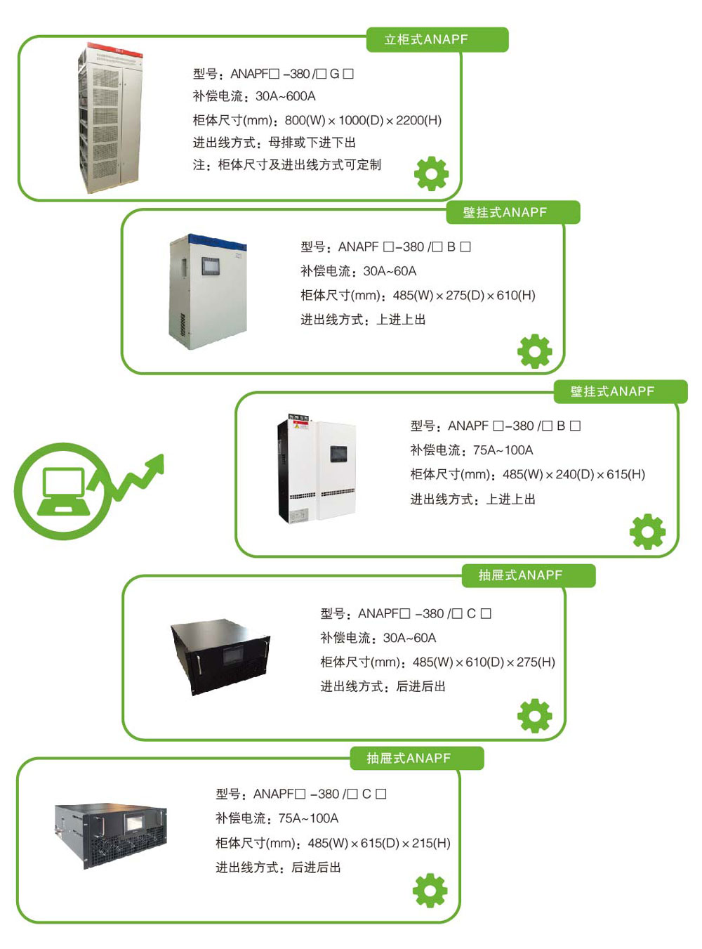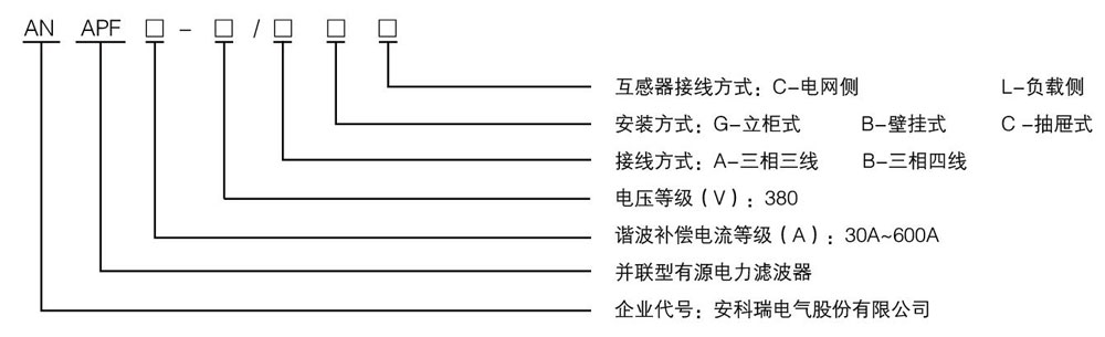適用于并聯(lián)在含諧波負(fù)載的低壓配電系統(tǒng)中,能夠?qū)討B(tài)變化的諧波電流進(jìn)行快速實時的跟蹤和補(bǔ)償。訂貨范例: