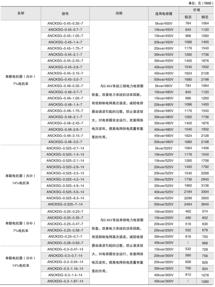 ANCK系列串聯電抗器與ANBSMJ系列自愈式低壓并聯電容器配套使用,主要用于提高0.4kV電力系統的功率因數,有效抑制電網的高次諧波,減輕電容器由諧波引起的過載,防止諧波放大,對電容器的安全運行,改善網絡電壓波形,提高供電質量和電網安全經濟運行起良好作用。