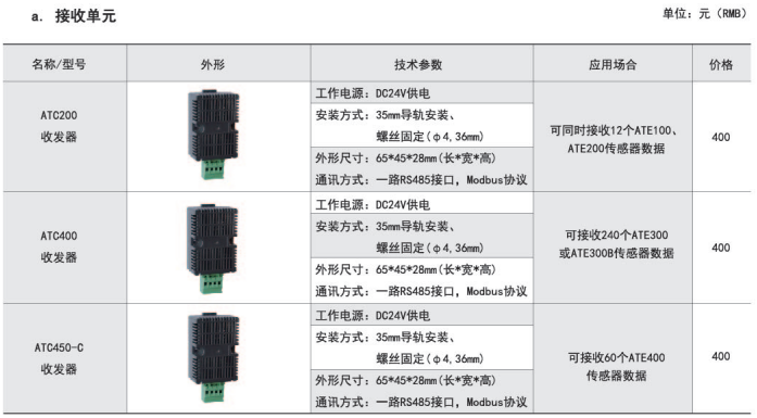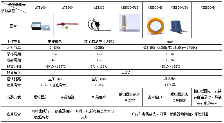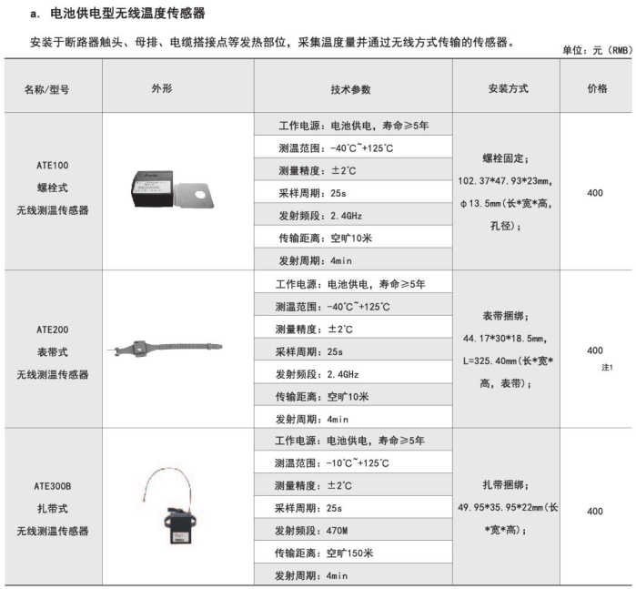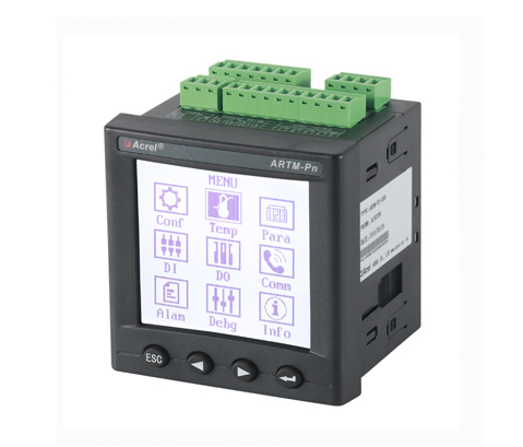 ARTM-Pn無線測溫裝置:ARTM-Pn無線測溫裝置可以單獨安裝在高壓柜、低壓抽屜柜內,每臺裝置可以接收18個傳感器的數據,傳感器型號可選配ATE100、ATE200、ATE300。裝置帶有一路485接口,可將采集到的溫度數據上傳到監控中心。