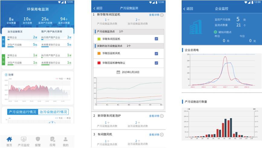 平臺首頁顯示企業概況,用電統計,產污設施運行柱狀圖,治污設施運行柱狀圖,如圖所示: