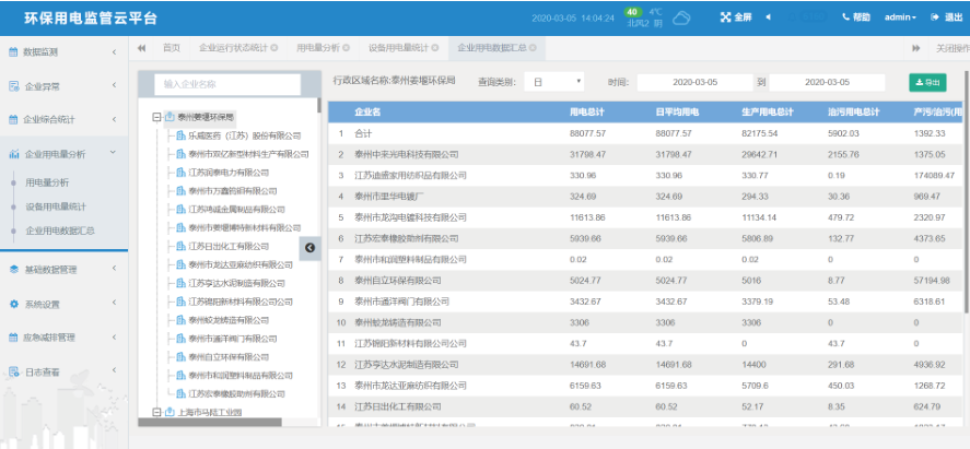 2.5.3企業用電數據分析:按年/月/日統計企業以及行政區域的總用電情況,可導出成報表。